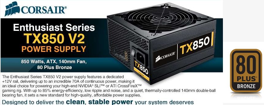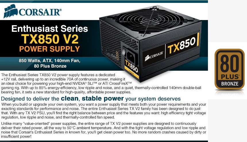 4) CORSAIR Enthusiast Series TX850W V2 70A 80+ BRONZE
