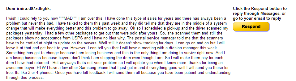 ჩემგან დამოუკიდებელი პრობლემები არისო და ვცდილობ მოგვარებასო და მადლობას გიხდი კარგი მყიდველი ხარო და ვინაიდან კარგი ფიდბექი დამიტოვე ეს ყველაფერი რომ დამთავრდება 3-4 სამსუნგი მაქვს კიდევ და უფასოდ გამოგიგზავნიო