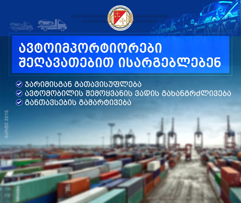• საქართველოში 1 აპრილამდე იმპორტირებული ავტომობილის მფლობელი საქართველოს მოქალაქე გათავისუფლდება ჯარიმისგან, თუ იგი 2015 წლის 1 სექტემბრამდე გააფორმებს ავტომობილს