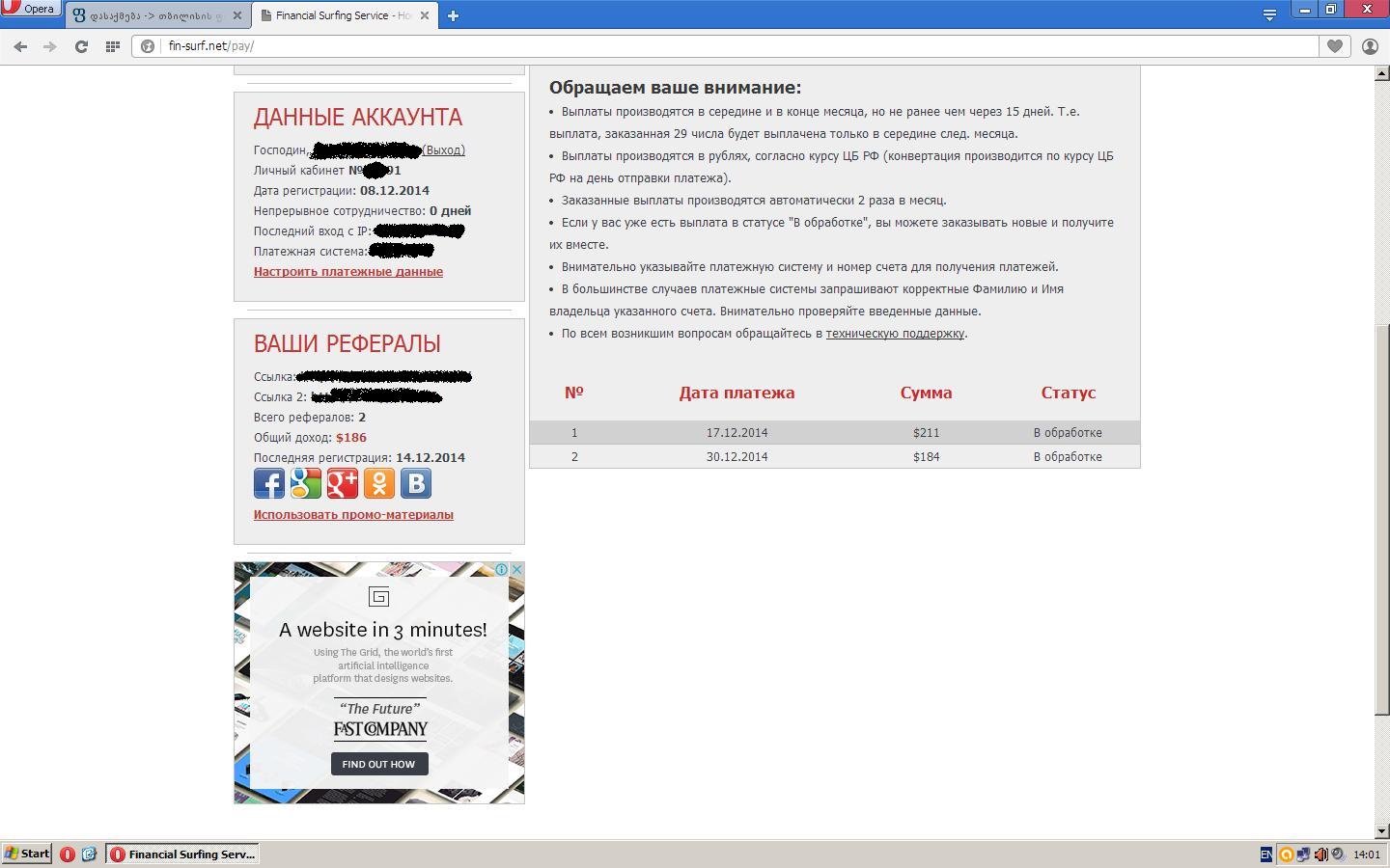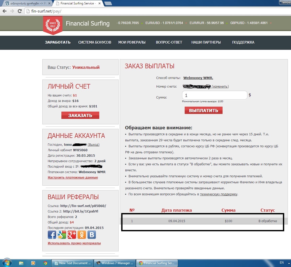 http://fin-surf.net/p85060/რეგისტრაციის მერე ანგარიშზე გაქ 5 $ და უნდა ჩადო რაღაც ფირმებში( მანდ წერია საიტზე მიხვდებით) და მინიმუმ 100$ უნდა ააგროვო რო გადარიცხო ავაგროვე 101 $ (ამ ფულის ჩადებით ფირმებში ვიმეორებ მე კაპიკიც არ ჩამიდია რაც მაჩუქეს რეგისტრაციის მერე5$ იმით დავიწყე) და მივეცი გადარიცხვას 100 $ და სკრინზე თვითონ ნახეთ რომ მუშავდება გადარიცხვა (წერია რო თვეში ორჯერ ხდება გადარიცხვა)