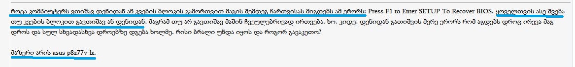 როცა კომპიუტერს ვთიშავ დენიდან ან კვების ბლოკის გამორთვით მაგის შემდეგ ჩართვისას მიგდებს ამ ერორს: Press F1 to Enter SETUP To Recover BIOS. ყოველთვის ასე შვება თუ კვების ბლოკით გავთიშავ ან დენიდან, მაგრამ თუ არ გავთიშავ მაშინ ჩვეულებრივად ირთვება. ხო, კიდე, დენიდან გათიშვის მერე ერორს რომ აგდებს დროც ირევა მაგ დროს და სულ სხვადასხვა დროებზე დგება ხოლმე. რისი ბრალი უნდა იყოს და როგორ გავაკეთო?