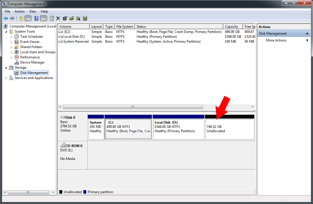 მაგ 746 გიგაბაიტს მარჯვენა კნოპკით მიაჭირე და აირჩიე new simple volume მიყევი ინსტრუქციებს და გაჩნდება E დისკი კომპიუტერში