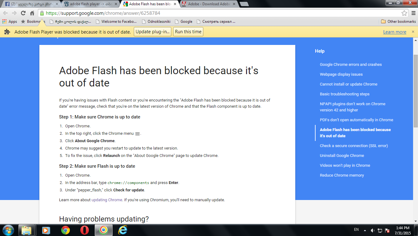 გამარჯობათ. თქვენი დახმარება მჭირდება Chrome ში რომ შევდივარ მიწერს adobe flash player was blocked because it is out date update plug-in ვერ გავიგე რა ჯანდაბა უნდა აშკარად მაქ ადობე დაინსტალირებული