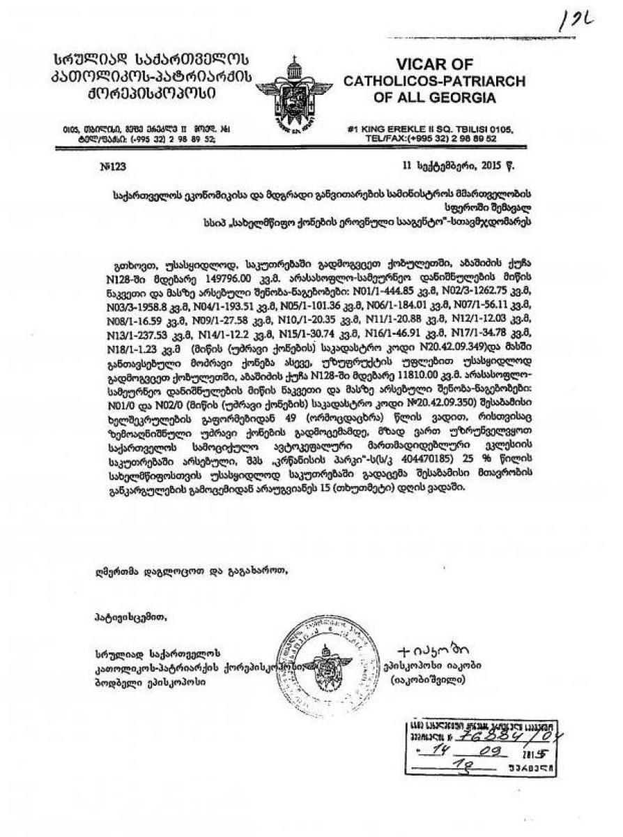 გასული წლის 4 მარტს პრემიერ-მინისტრმა ირაკლი ღარიბაშვილმა გააუქმა პირობა, რომელიც უძრავ ქონებაზე საპატრიარქოს უფლებას ზღუდავდა. ამით საპატრიარქოს მილიონობით კვადრატული მეტრი მიწის ფართობის გასხვისების უფლება მიეცა (მთავრობას, პრეზიდენტის მიერ დადგენილი საპრივატიზებო პირობის გაუქმების უფლება 2013 წლის სექტემბერში „სახელმწიფო ქონების შესახებ" კანონში შეტანილი ცვლილებით მიეცა. ამ ცვლილებით მთავრობას შეუძლია დაადგინოს არსებულისგან განსხვავებული საპრივატიზებო პირობა, რის შემდეგაც პრეზიდენტის აქტით ადრე დადგენილი შესაბამისი პირობა უქმდება).