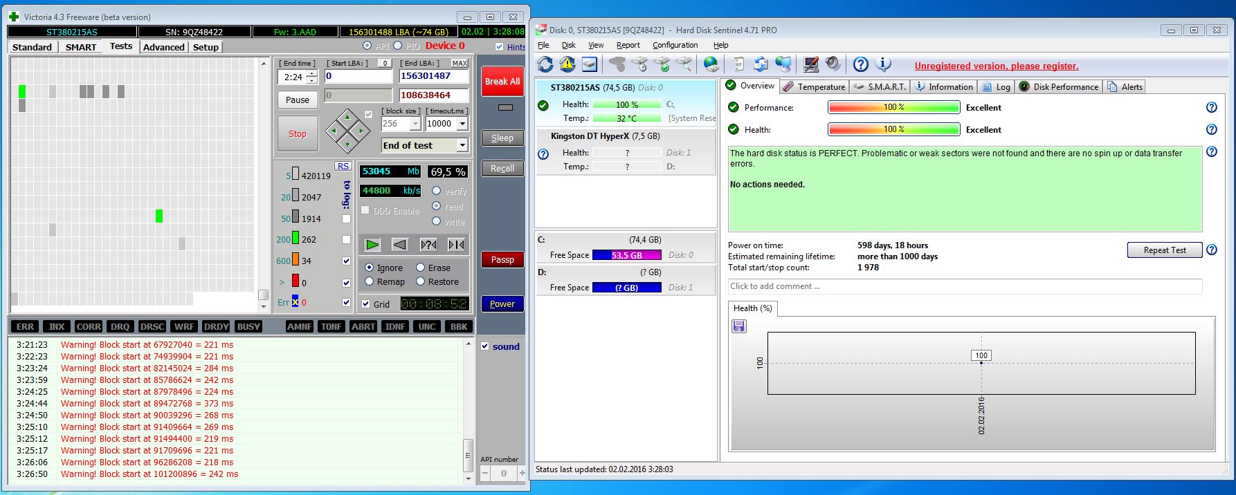 HD Tune-ში Health ტაბის სქრინშოტი მინდა და Hard Disk Sentinel-ში Temperatures ტაბის.