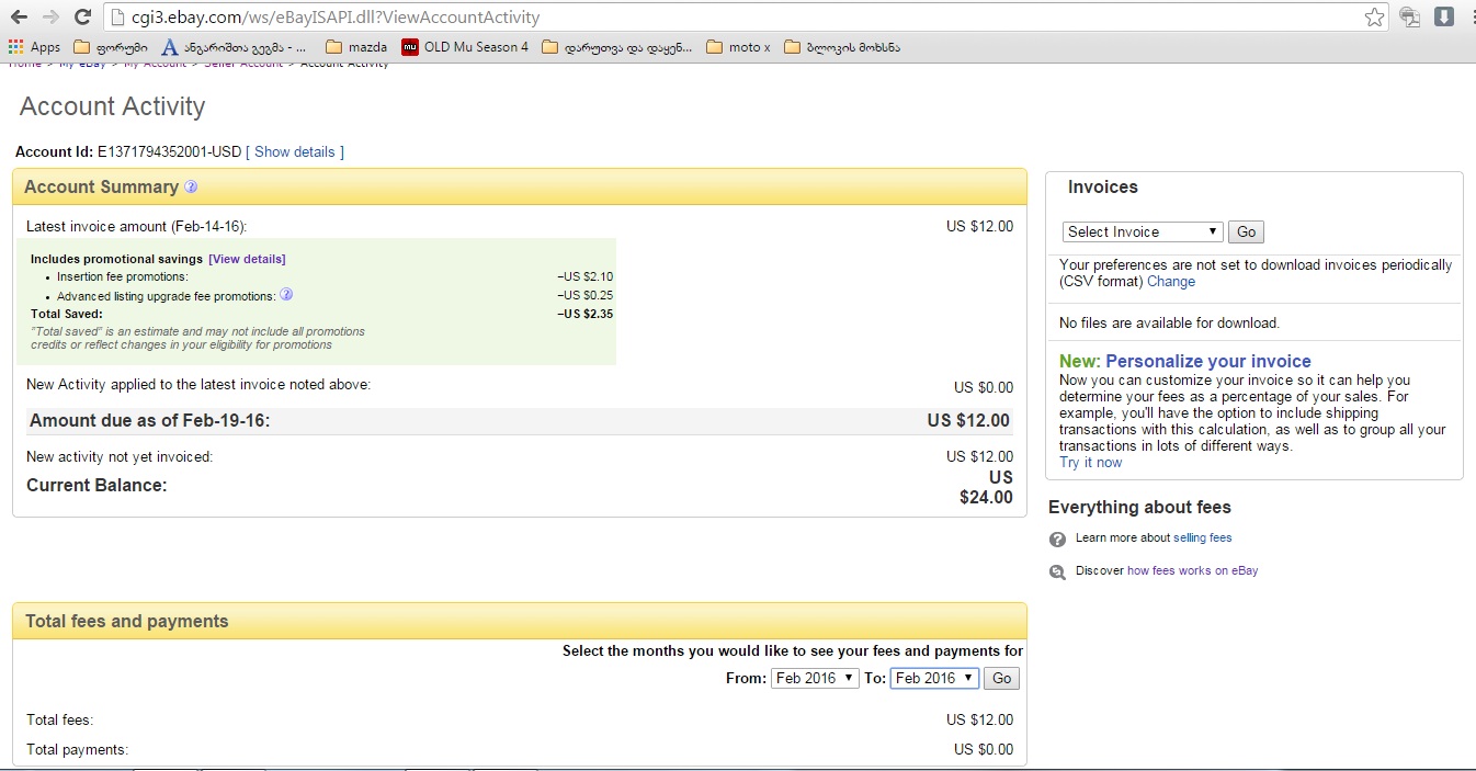 იბეიზე დავიწყე სელერობა ლიმიტი 25 000 $ მაქ და 1000 ნივთის დადების უფლება 10 მომსახურება მაქ დადებული 30-30 მინიმუმ 15 000 ჯამური თანხით და ეხლა ინვოისი მომივიდა რომ 12 დოლარი უნდა გადავუხადო იბეის და რა თანხას მახდევინებენ შეგიძლიათ გამარკვიოთ ?