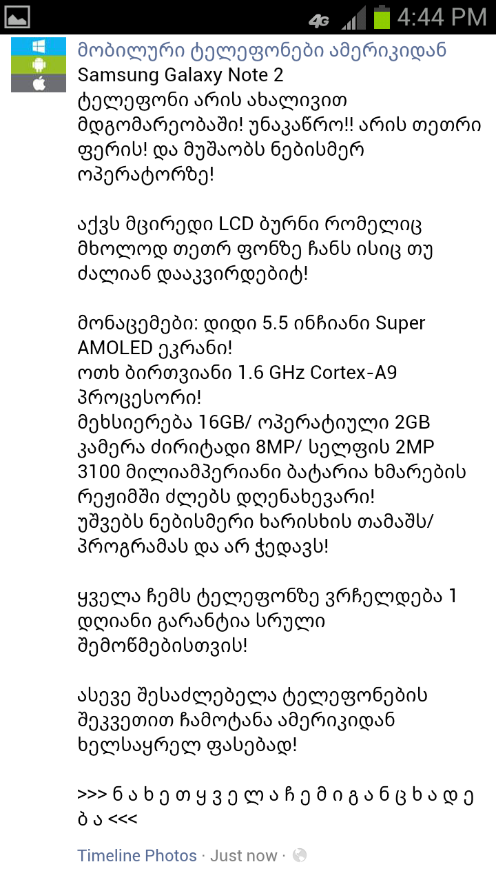 იყიდება Samsung Galaxy Note 2 16GB 230 ლარად!