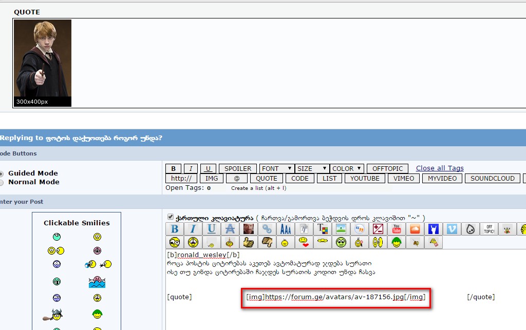 ვაჭერ დაციტირებას > ქვედა ფანჯარაში ხომ ჩნდება სურათის კოდი > სურათის კოდს ვაკოპირებ და ქვედა ციტირების ფანჯრიდან ვშლი > მერე ვსვავ ზედა ფანჯარაში როგორც ჩვეულებრივი დაქუოთებისას