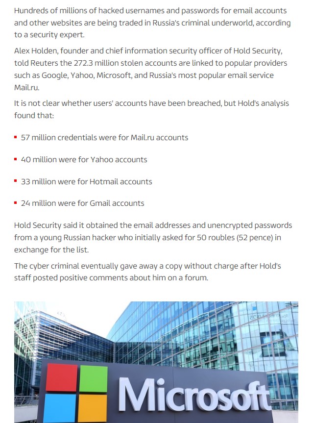 Alex Holden, founder and chief information security officer of Hold Security, told Reuters the 272.3 million stolen accounts are linked to popular providers such as Google, Yahoo, Microsoft, and Russia's most popular email service Mail.ru.
