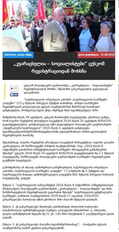 მიმდინარე წლის 29 აგვისტოს, ცესკოს მოთხოვნის საფუძველზე, ცნობილი გახდა, რომ საჯარო რეესტრის ეროვნული სააგენტოს 2016 წლის 24 აგვისტოს N204320 გადაწყვეტილებით, განუხილველად იქნა დატოვებული პოლიტიკური გაერთიანების „ნეიტრალური საქართველო“ 2016 წლის 1 აგვისტოს განცხადება ხელმძღვანელობაზე/წარმომადგენლობაზე უფლებამოსილი პირის ცვლილებით რეგისტრაციის თაობაზე.