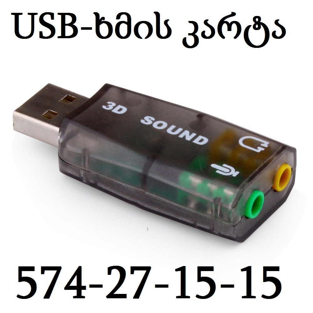 USB ხმის ბარათი (საუნდ კარტა) შეგიძლიათ შეაერთოდ როგორც ყურსასმენი ან დინამიკები ასევე მიკროფონიც, არ საჭიროებს დრაივერის ინსტალაციას, იდეალური მოწყობილობაა იმათთვის ვისაც კომპიუტერში ავქვს გადამწვარი ხმის ბარათი. ფასი 15 ლარი.