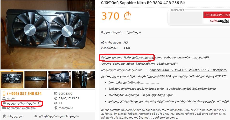იყიდება ფაქტიურად ახალი XFX R9 380X 4GB