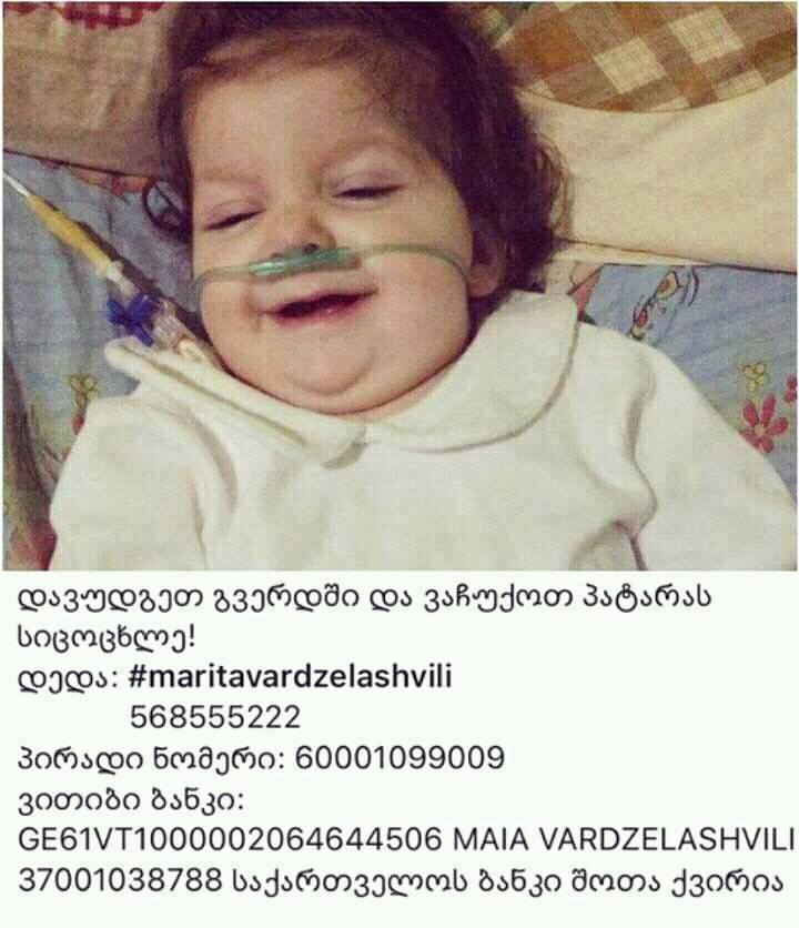 გამარჯობათ მე ახალი ვარ ფორუმზე და ძალიან ჭირდება თქვენი დახმარება გთხოვთ უყურადღებოდ ნუ დამიტოვებტ ამ მონაწერს...დღეს ვიცი საქართველოში რთული სიტოაციაა და აქედან გამომდინარე ბევრი ადამიანი ითხოვს დახმარებას მეც ერთ ერთი მათგანი გავხდი პატარა ვივიანას გამო რომელიც საჭიროებს გერმანიაში მკურნალობას რომლის ჯანმრთელობის მდგომარეობა რთულდება ყოველდღიურად ზოგს მობეზრებული აქვს მსგავსი შინაარსის პოსტები და თემები მაგრამ მე მჯერა არსებობენ ადამიანები ვინც გულთან ახლოს მიიტანს პატარას მდგომარეობას და გვერდსჰი დამიდგებიან რომ დავეხმაროთ ერთად და მივცეთ მომავლის იმედი მის მშობლებს და ოჯახს.ბავშვს ნუ დავტოვებთ უყურადღებოდ ძალიან გთხოვტ გამოგვეხმაურეთ ერტად ვაკეთოთ სიკეთე დავუბრუნოთ დედას ჯანმრთელი შვილი ერთმანეთის გვერდში დგომით მე მჯერა ბევრ რამეს შევძლებთ ეს პატარა გოგონა არის ვივიანა 1.8 წლის. მას თავისი სიცოცხლის დიდი ნაწილი საავადმყოფოში აქვს გატარებული.მას აქვს ნევროლოგიური პრობლემა კორძიანი სხეულის დისგენეზია,რაც ხელს უშლის ფსიქო- მოტორულ განვითარებას.ამასთან ერთად აქვს ცერებრალური დამბლა მინიჭებული კოდი j.80 .ვივიანას პრობლემა კიდევ ისე არის რომ ყოველ კვირას ხვდება საავადმყოფოში მაღალი სიცხით,დიარეით,ღებინებით,ჩირქოვანი ანგინით.საავადმყოფოში გატარებული ყოველი დღე ბავშვისთვის უკვე დიდი სტრესია.შიშები დაეწყო უმიზეზოდ ტირის. დიაგნოზი ვერ გავიგეთ საიდან ემართება ასე ხშირად ვირუსი.ყველაფერზე შემოწმებულია ანალიზები წესრიგშია.გადავწყვიტეთ წავიყვანოთ გერმანიაში და ვუმკურნალოთ.ვივიანას მიუხედავად მისი დიაგნოზის სიმძიმისა აქვს შანსი, რომ ფეხზე დადგეს და გაიაროს მუდმივი ფსიქო-მოტორული თერაპიის ჩატარების შემდეგ.ყველას გთხოვთ დაგვეხმარეთ წავიყვანო გერმანიაში და დავასრულო ვივიანას ტანჯვა.თურქეთში მყავდა რამდენიმე თვის უკან ,რადგან 7ჯერ გადაიტანა ფილტვების ანთება და აქ მაშინაც ვერ გაიგეს ვერაფერი.მაშინაც ხალხის დახმარებით წავიყვანე და იქ კისტა დაადგინეს თავში და ადენოიდები ცხვირში მეტი ვერაფერი...დაგვიდექით გვერდით გთხოვთ სამი შვილი მყავს ახალგაზრდა დედა ვარ და მინდა შვილებთან ბედნიერად ცხოვრება.მხოლოდ ჯანმრთელობა მინდა სამივეს მეტი არაფერი.ყველაფერი გავყიდე რაც გამაჩნდა არაფერი არ მაბადია ამ ქვეყნად.გთხოვთ მიიტანოთ გულთან ჩემი ტკივილი.ჩემი ანგარიშის ნომერია GE06BG0000000992110300 საქართველოს ბანკი მიმღები შოთა ქვირია.პირადი ნომერი 37001038788... მაია ვარძელაშვილი ვითიბი ბანკი GE61VT1000002064644506 ...პირადი ნომერი 60001099009 საქარ