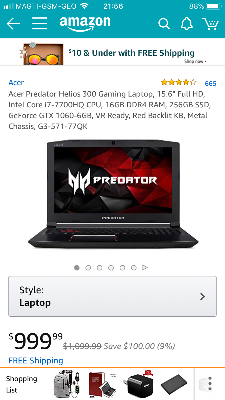 ფასი 1000 ღირს და 180$ განბაჟება.. ჩამოტანაც მაქს 16$.. საერთო ჯამში გამოვიდა 1200 დოლარი მაქს ჩამოტანიან ყველაფრიანა.. აქ კიდე ეგ პრედატორის ლეპტოპი 4990 ლარი ღირს ალტაში..