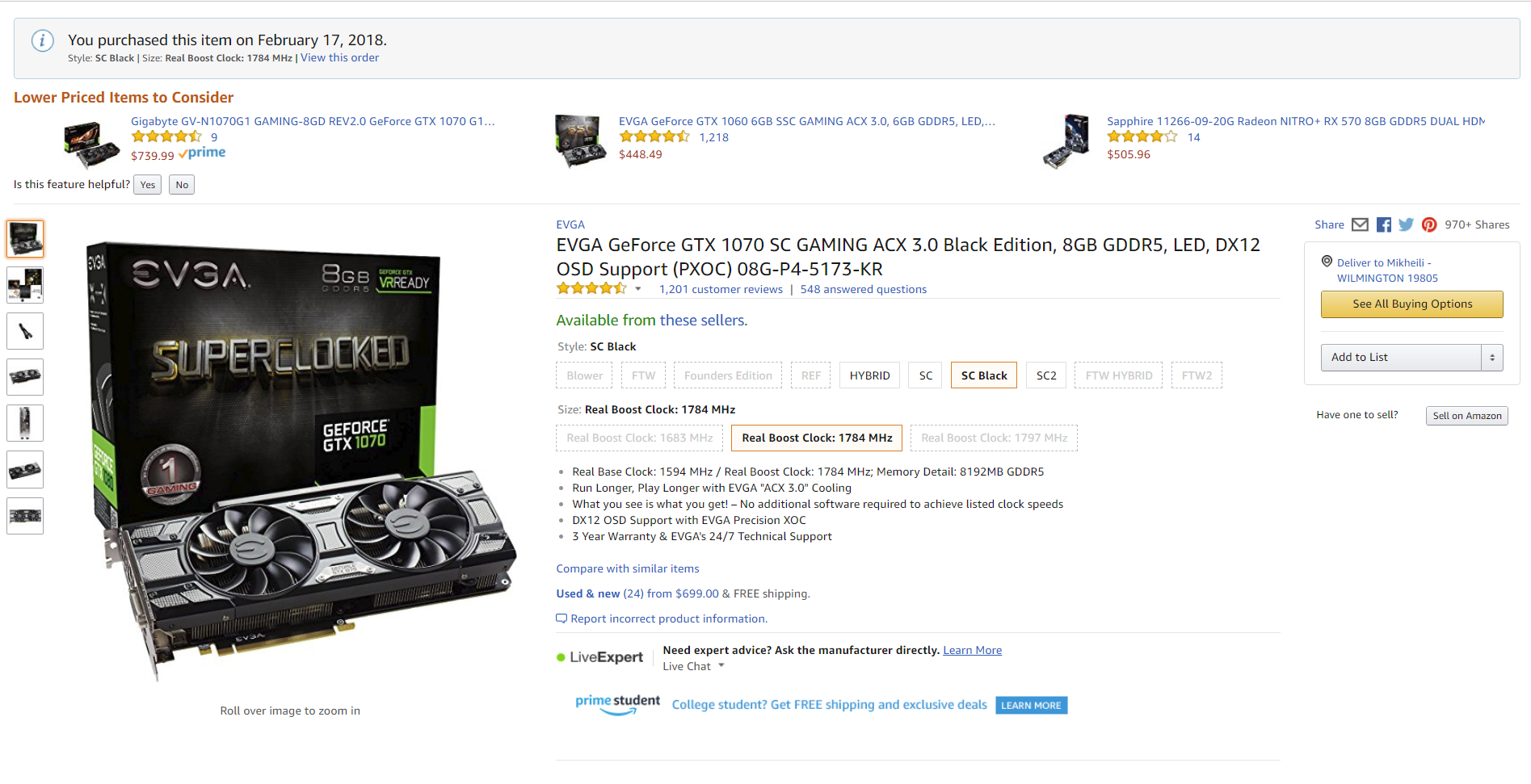 * * * იყიდება * * * EVGA GTX 1070 SC Black Edition, 1750 ლარად ! ახალი - გაუხნელ ყუთში