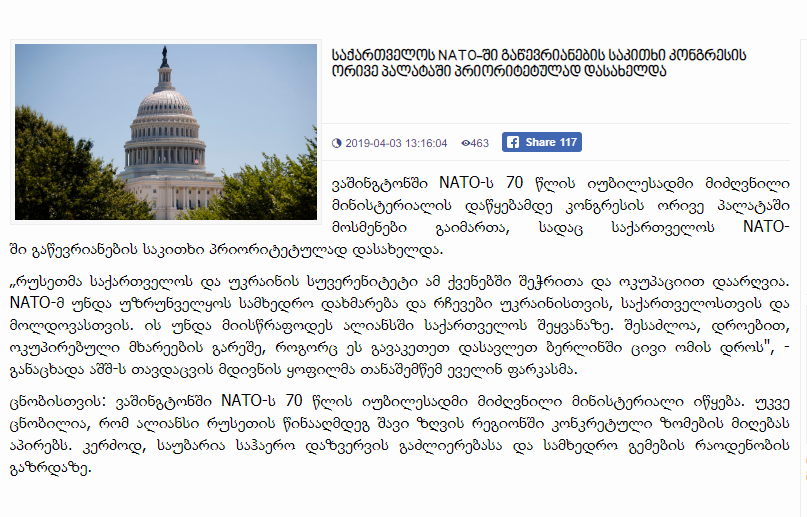 საქართველოს NATO-ში გაწევრიანების საკითხი კონგრესის, ორივე პალატაში პრიორიტეტულად დასახელდა