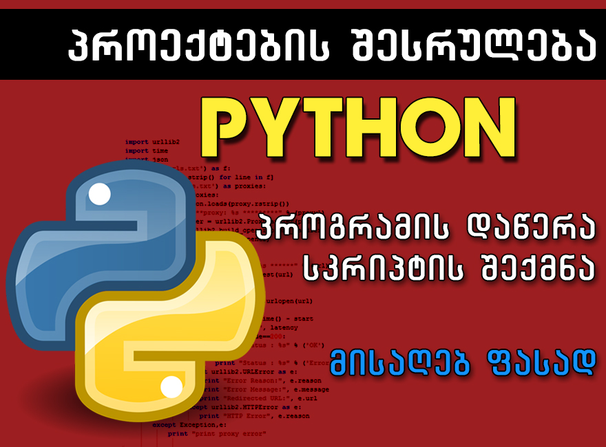 გთავაზობთ პროექტების, პროგრამების და დავალებების დაწერას პროგრამირების ენა Python - ზე. დაგეხმარებით Python-ზე დაწერილი ნებისმიერი სირთულის სკრიპტის, პროგრამის და პროექტის შექმნაში.