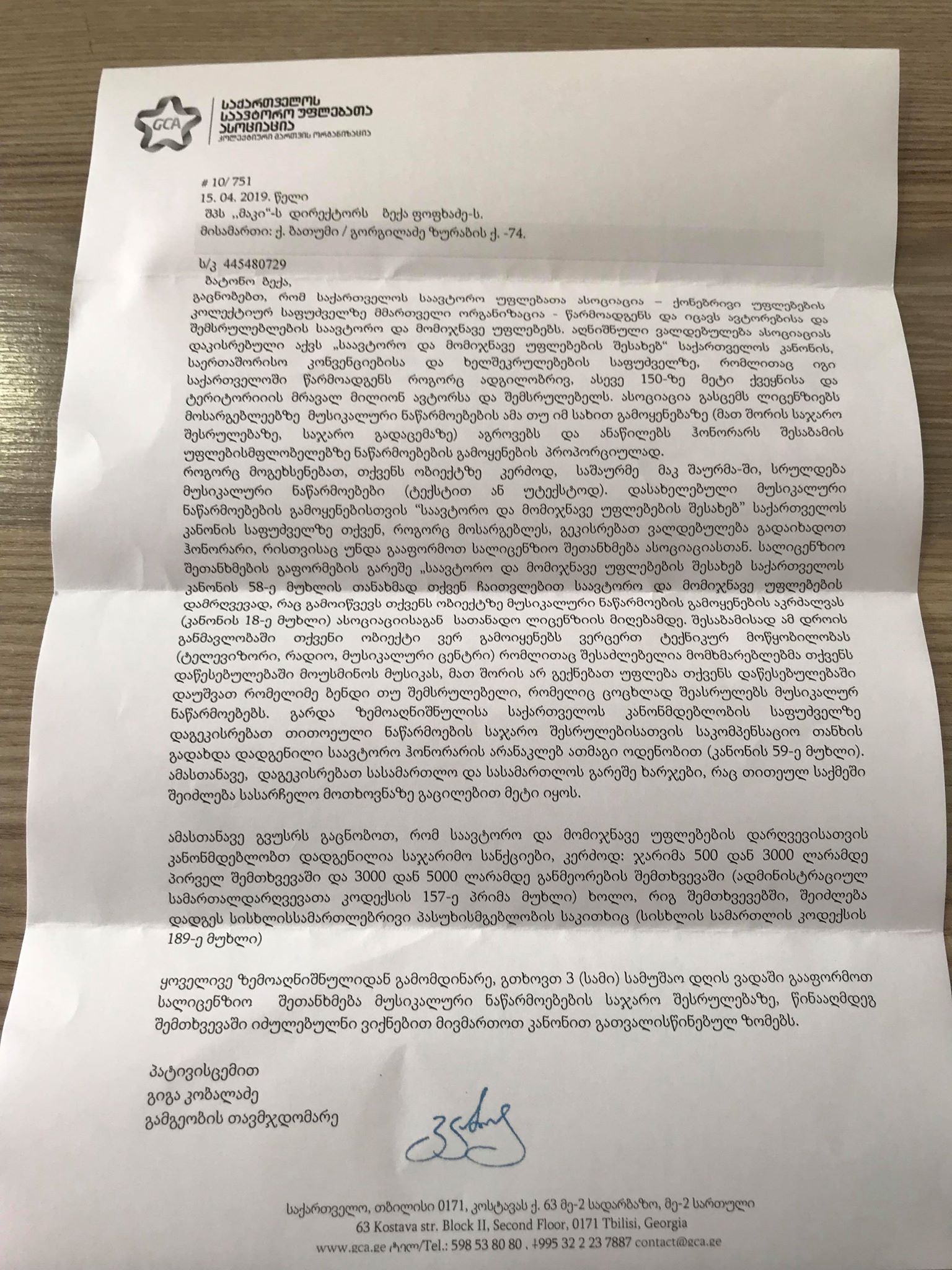 გამარჯობათ, მაქვს კვების ობიექტი დღეს მოვიდა წერილი სადაც წერია რომ ჩვენ ვარღვევთ რაღაც კანონებს ბლა ბლა ბლა.