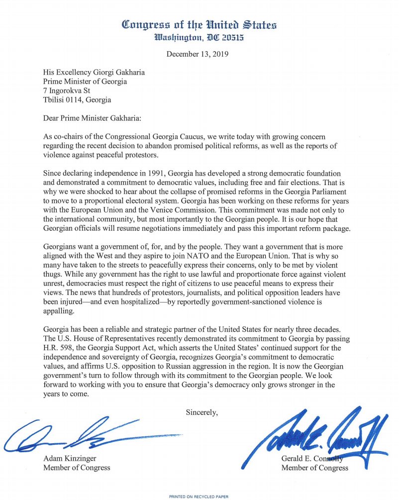 აშშ-ის კონგრესში საქართველოს მეგობართა ჯგუფი საქართველოს პრემიერ-მინისტრს, გიორგი გახარიას მიმართავს ღია წერილით, რომელშიც მზარდ შეშფოთებას გამოთქვამს "ახლახან მიღებულ გადაწყვეტილებაზე უარი თქმულიყო დაპირებულ პოლიტიკურ რეფორმებზე, ისევე, როგორც ძალადობის შესახებ ცნობებზე მშვიდობიანი საპროტესტო აქციების წინააღმდეგ".
