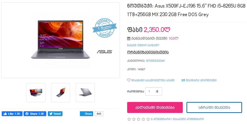 იყიდება ახალი ლეპტოპი, აქვს 1 წლიანი მაღაზიის გარანტია, 2350 ლარი ღირს მაღაზიაში, სასწრაფოდ ვყიდი 1950 ლარად ან ნაკლებად.