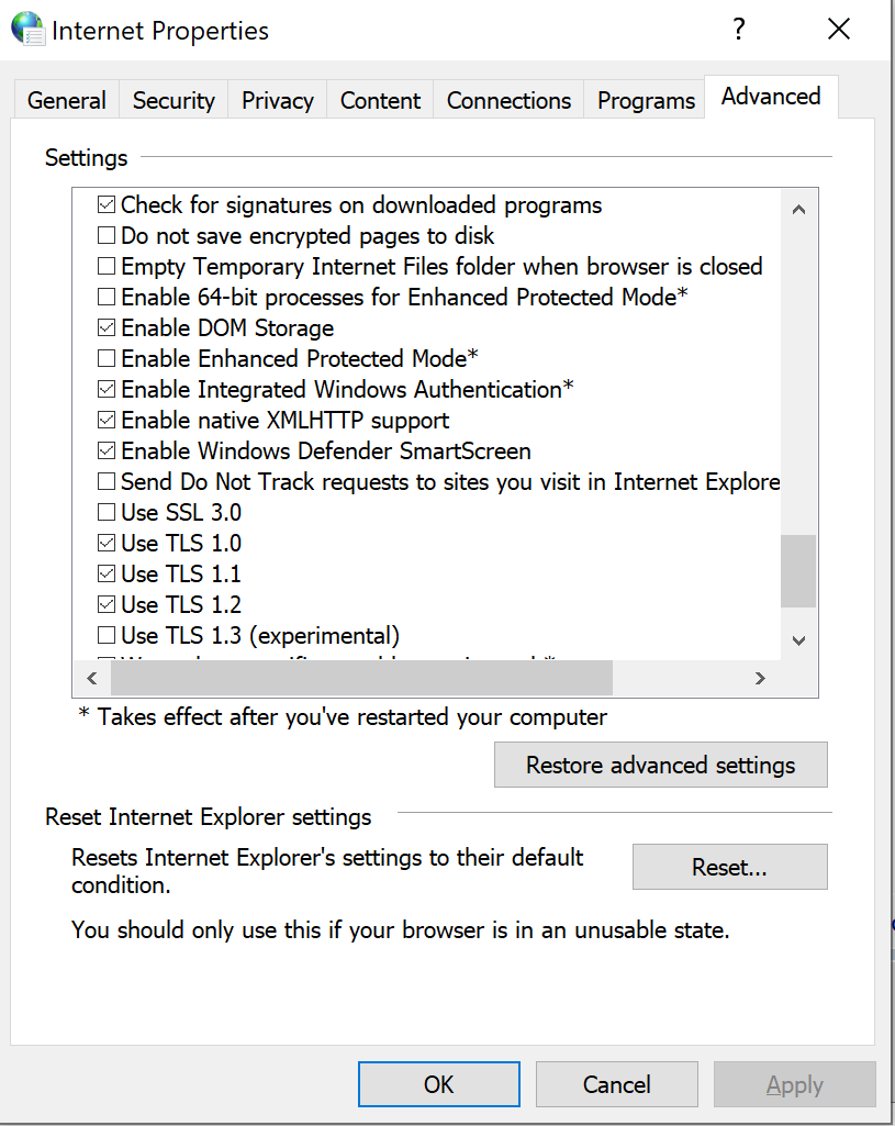 ან შედი Control Panel - Internet options, გადადი Advanced ფურცელზე და ჩაურთე