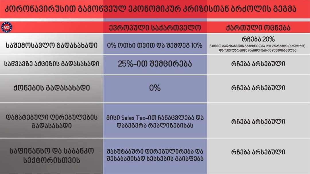 5. ხელისუფლება არ აკეთებს არაფერს გადასახადების შესამცირებლად. ევროპულ საქართველოში კი მიიჩნევენ, ეკონომიკის გადასარჩენად და ასი ათასობით ოჯახის სიღარიბისგან სახსნელად, მნიშვნელოვანია საშემოსავლო გადასახადის განულება 4 თვით, ხოლო შემდეგ მისი 10%-ზე გაჩერება (1.7 მლრდ ლარი) , ასევე საწვავზე აქციზის გადასახადის 25%-ით შემცირება (150 მლნ), ქონების გადასახადის განულება (390 მლნ) ხოლო დამატებითი ღირებულების გადასახადის ცვლილება და მხოლოდ გაყიდული საქონლის დაბეგვრა.