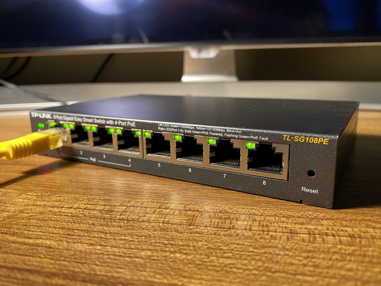 არის 8 პორტიანი, საიდანაც 4 პორტი არის PoE. თითო პორტზე ~15 ვატს აწვდის.