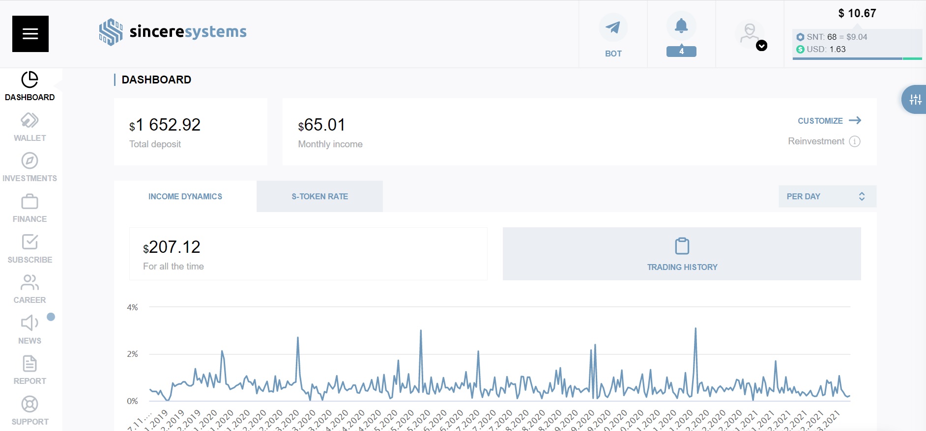 პროექტი გაეშვა 2019 წლის ბოლოს. მუშაობს რამდენიმე მიმართულებით. ფორექსი, სამედიცინო მარიხუანა, ავტო-ლიზინგი (ჯერ-ჯერობით მარტო 4 ქვეყანაში, გერმანია, ჩეხეთი, ესტონეთი, რუსეთი), კრიპტოვალუტა, უძრავი ქონება. ზაფხულისთვის გეგმავს საკუთარი ბანკის გახსნას. აქვს საერთაშორისო კოდი LEI, თავისი ელექტრონული საფულე, ბლოკჩეინი, 24 საათიანი ონლაი დახმარება. ქირაობს კომპანია DDS-სგან ხელოვნულ ინტელექტს, რომელიც ვაჭრობს ფორექსზე, ძირითადად სუ პლიუსში. აქვს ბონუს სისტემა. რამდენიმე კაცმა უკვე აიღო საკმაოდ დიდი ჩეკი, ათეულ ათასობით. მინიმალური საინვესტიციო თანხა 100$. შესაძლებელია როგორც ქსელზე მუშაობა, ასევე მხოლოდ საკუთარი თანხის ჩადება. თუ ქსელზე მუშაობას აპირებთ, მაშინ 100$-თაც შეიძლება დაწყება. თუ საკუთარ ფულზე, მინიმუმ 1000$ მაინც უნდა ჩადოთ რო აზრი ქონდეს. ამ შემთხვევაში ყოველთვე დაგერიცხებათ 70-80$, ნავაჭრიდან გამომდინარე. დამატებითი კითხებისთვის მომწერეთ. კომპანია საკმაოდ სერიოზულია და გეგმავს გაფართოებას.