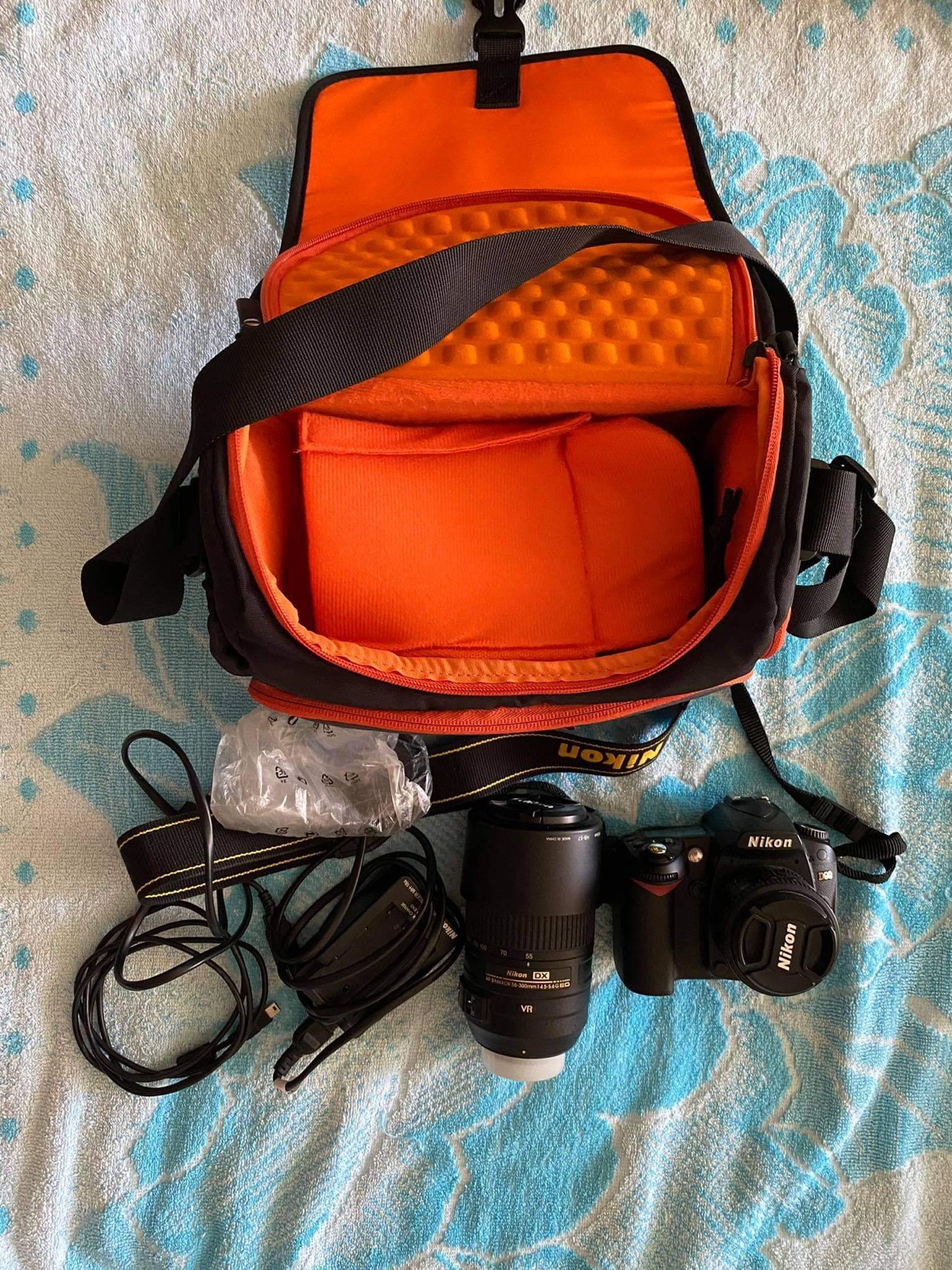 ნიკონ დ90, 50 და 55-300მმ ლინზები, ჩანთა, დამტენი, უსბ