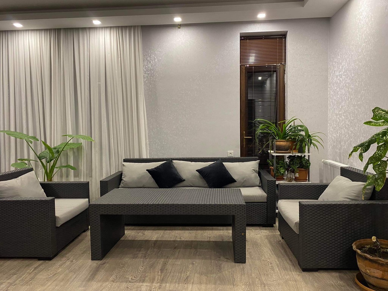 მაღალი ხარისხის დაწნული ავეჯი. კომპლექტში შედის: სამადგილიანი დივანი-210/70/80, ორი სავარძელი- 90/70/80, მაგიდა-140/70/50. ავეჯი დამზადებულია უმაღლესი ხარისხის პოლიპროპილენის ლენტით, უძლებს ნებისმიერ წონას, მზეზე არ იწვება და არ წყდება. კარკასი გაკეთებულია 2მმ-იანი სისქის რკინის მილკვადრატით. ბალიშები არის წყალგამძლე, იხსნება და ადვილად ირეცხება.