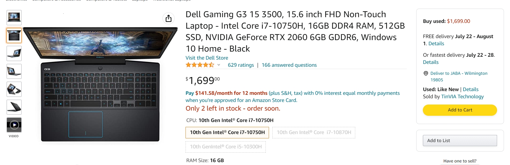 Dell Gaming G3 15 3500, 15.6 inch FHD144 hz - Intel Core i7-10750H, 16GB DDR4 RAM, 512GB SSD, NVIDIA GeForce RTX 2060 6GB GDDR6ლეპტოპი იდეალურ მდგომარეობაშია, მოყვება ჩანთა , ორიგინალი 240W დამტენი და mini display to hdmi გადამყვანი