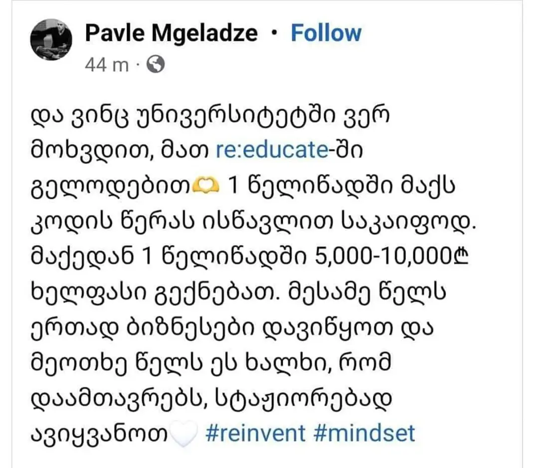 ან ბიჭო ყველა ბოზნესმენი თუ იქნება კოდი ვინღა უნდა წეროს? უნივერსიტეტ დამთავრებულებმა?