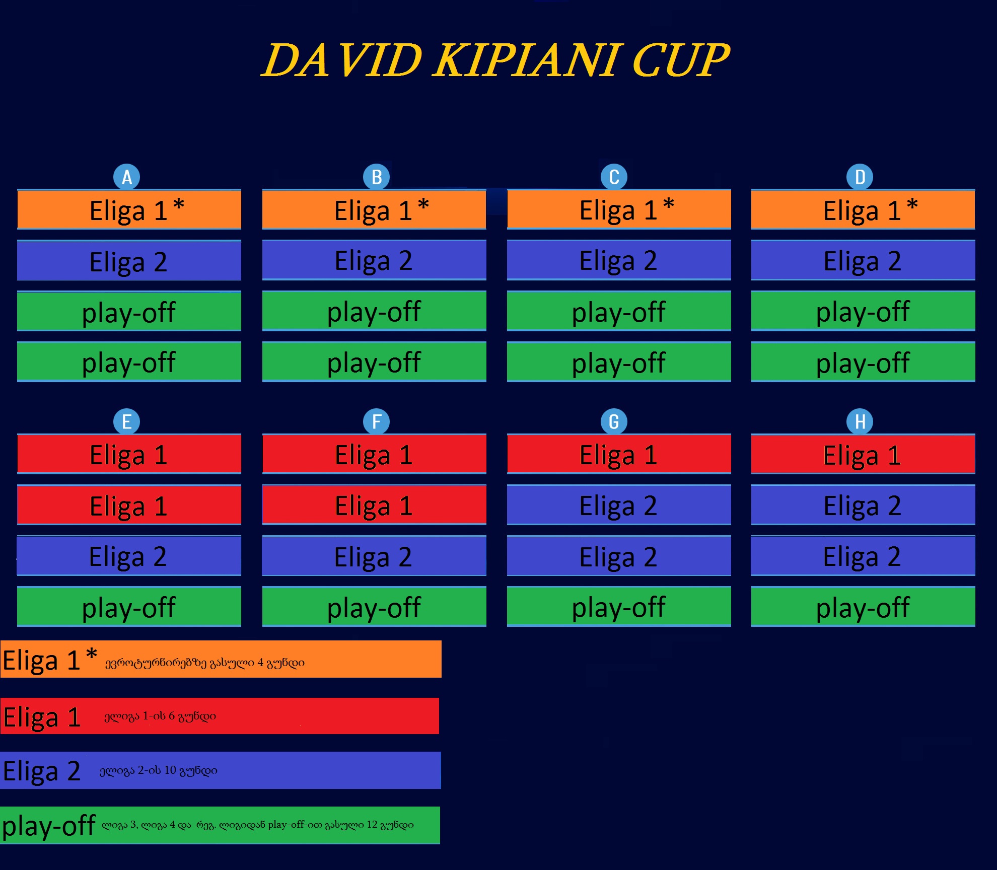 ჯგუფურ ეტაპზე ითამაშებენ: ელიგა 1-ის 10 გუნდი, ელიგა 2-ის 10 გუნდი, მეორე ეტაპზე გამარჯვებული 12 გუნდი