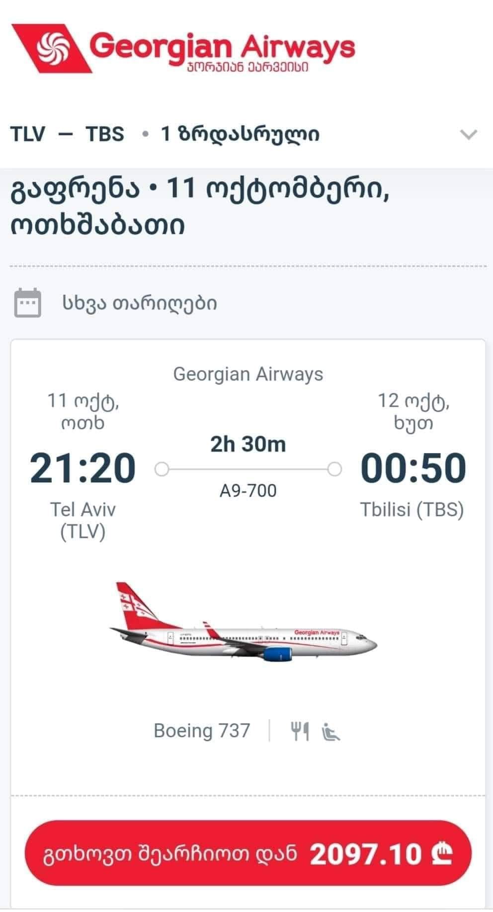 Georgian Airways -მა ისრაელიდან ავიაბილეთების ფასი გაზარდა