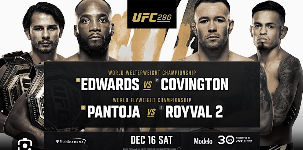 UFC 296 on December 16, 2023, features a welterweight title rematch: Leon Edwards vs. Colby Covington. Co-main event: Flyweight title bout - Alexandre Pantoja vs. Brandon Royval. Other main card fights include Rakhmonov vs. Thompson, Ferguson vs. Pimblett, and Luque vs. Garry. Main card starts at 7:00 PM PST on pay-per-view. Tickets range from $75 to $1,000, with VIP options available for an enhanced experience.