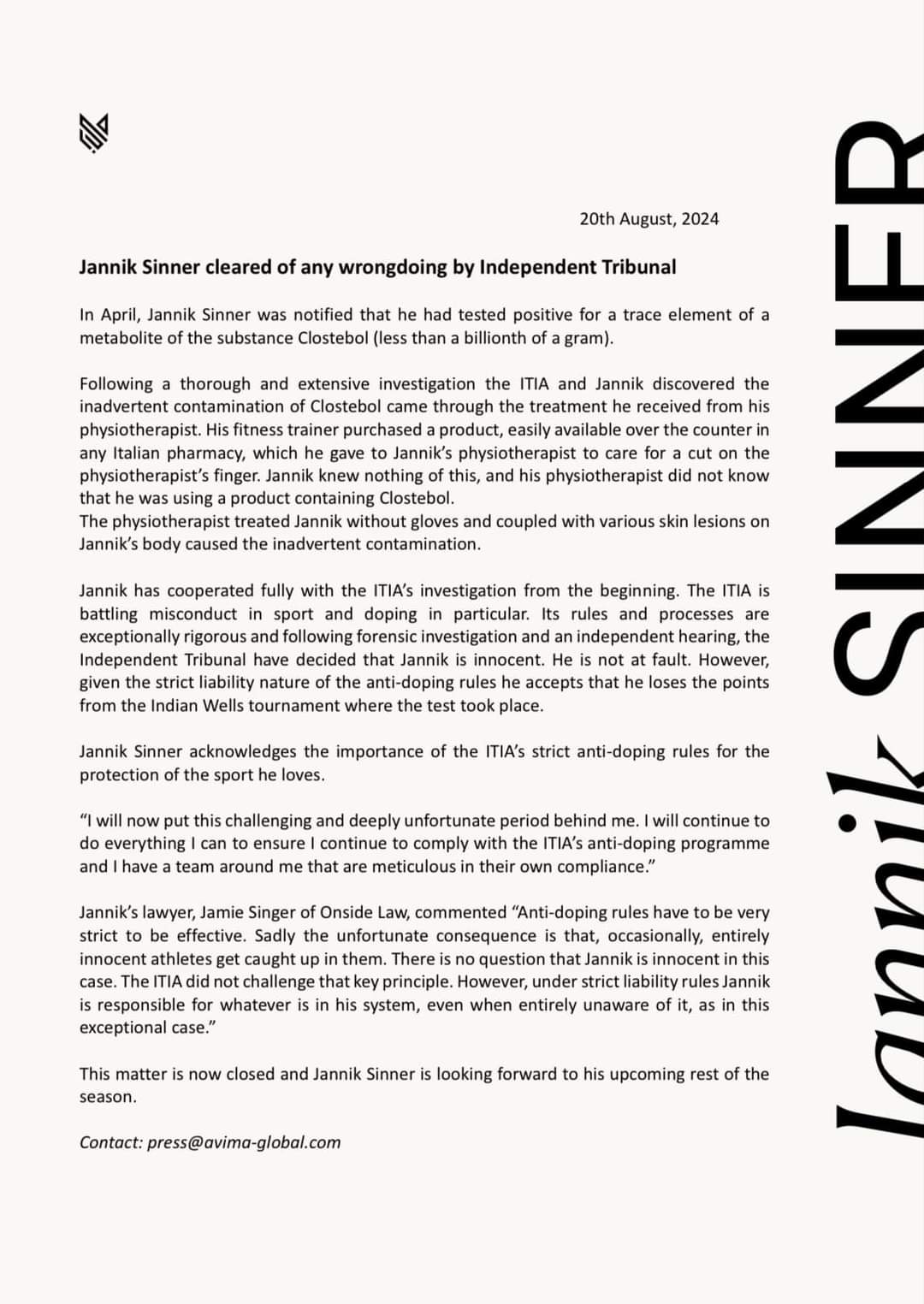 BREAKING: Jannik Sinner tested positive for a steroid twice but will not be suspended.