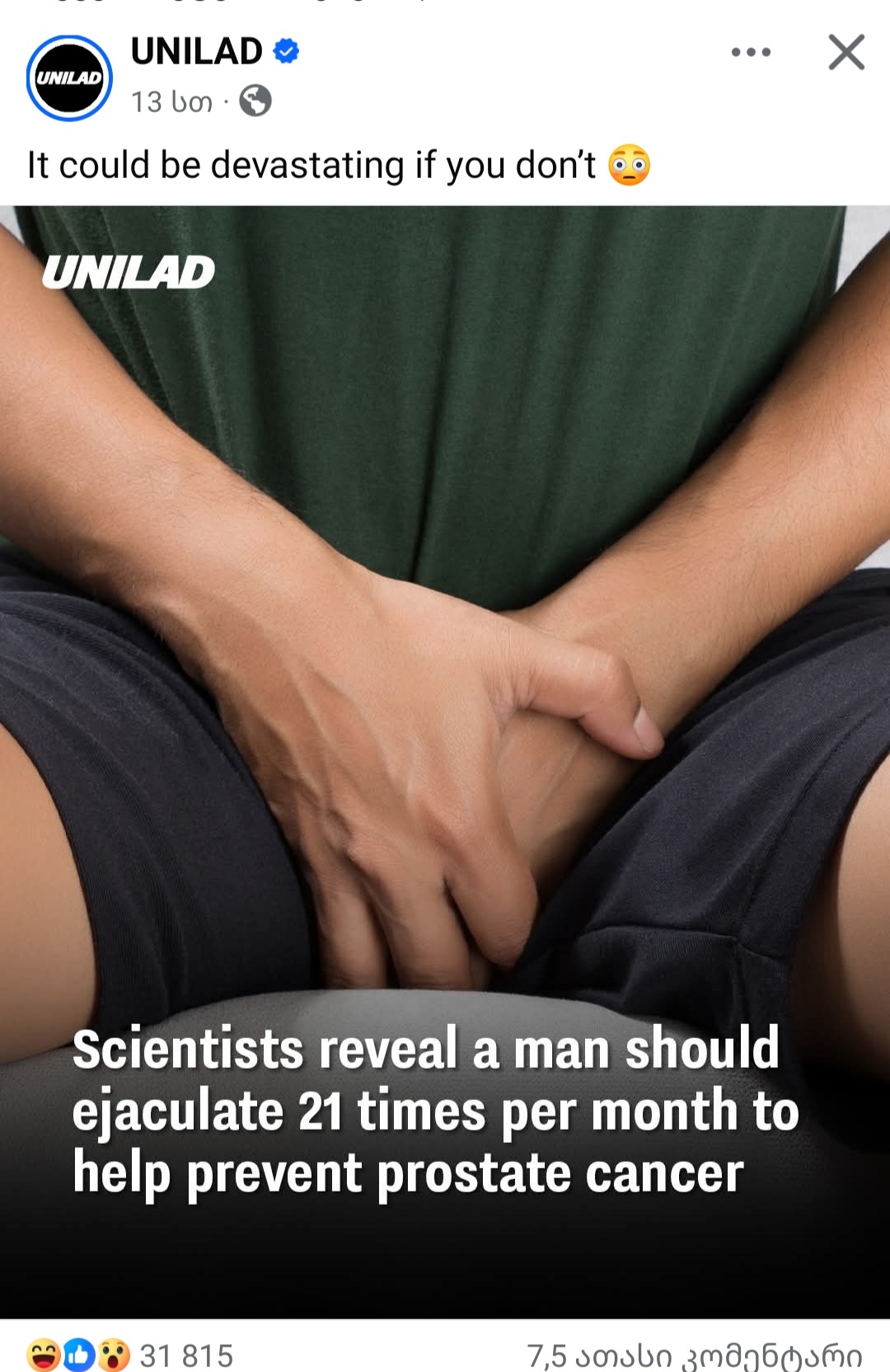 ბატონებო, სასიხარულო ამბავი მაქვს! ჰარვარდის უნივერსიტეტის მიერ ჩატარებულმა კვლევამ, რომელშიც 31,925 მამაკაცი მონაწილეობდა, დაადასტურა, რომ თვეში მინიმუმ 21-ჯერ ეაკულაცია პროსტატის კიბოს რისკს მნიშვნელოვნად ამცირებს. თურმე, ამდენი ხანია, საკუთარ ჯანმრთელობაზე ვზრუნავდით და არც ვიცოდით! ასე რომ, განაგრძეთ იგივე სულისკვეთებით, მეცნიერება ჩვენს მხარესაა!